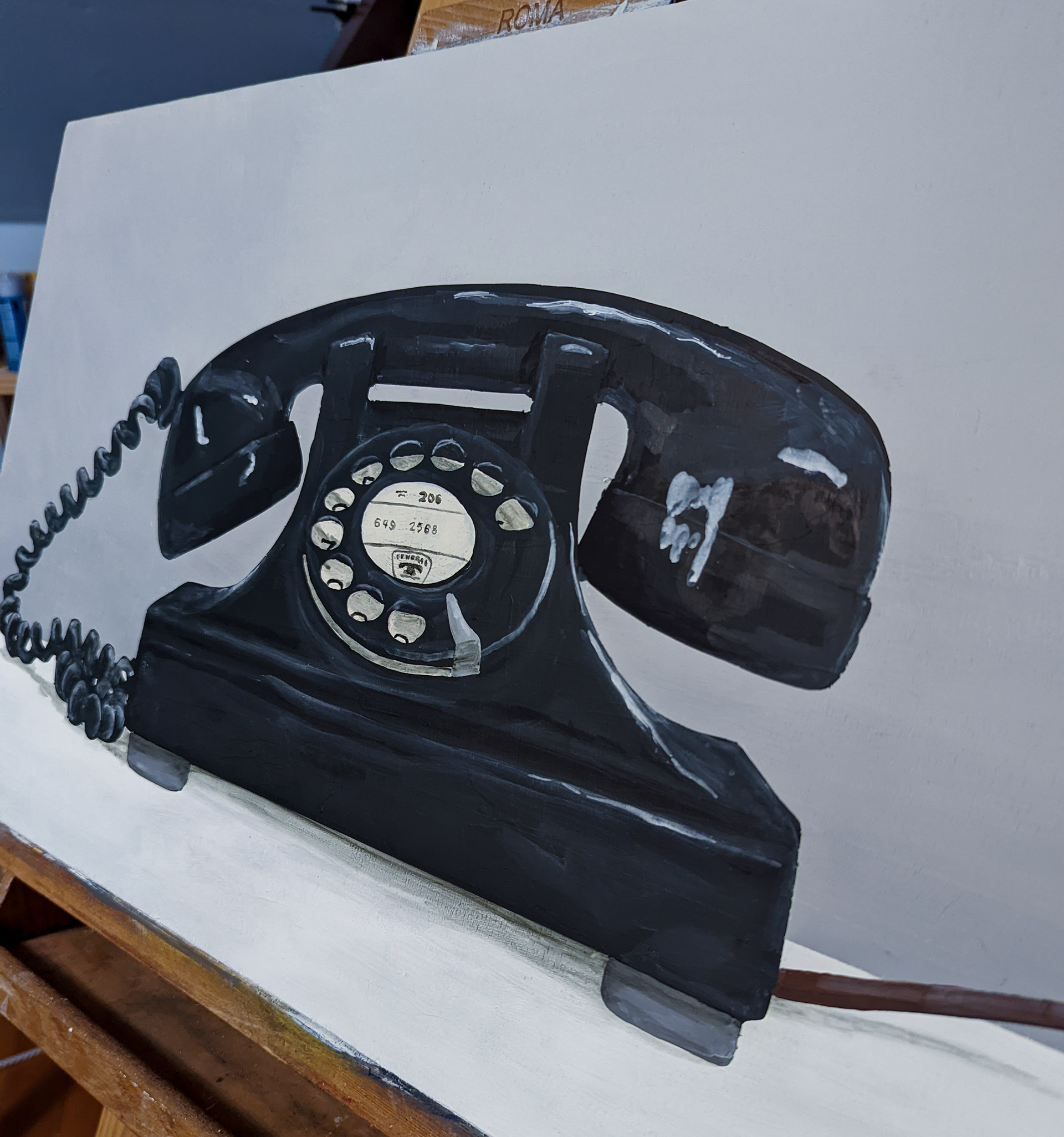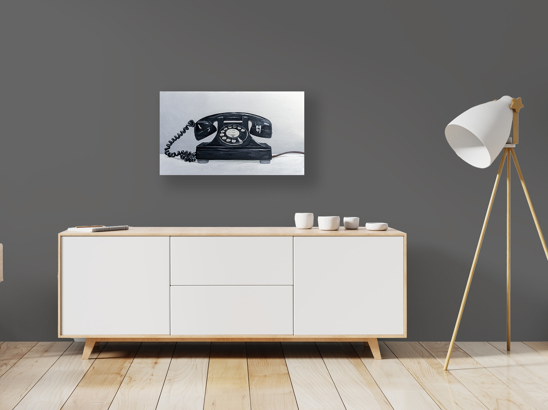 Iconic black desk phone with a modern twist. This painting features embedded NFC chip technology that when activated adds a secondary level of engagement.